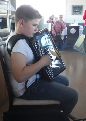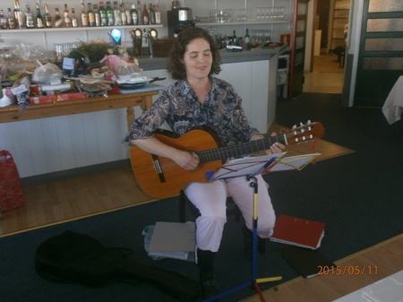 Undertiden vi drack kaffe anlände dagens underhållare, Helena Hollmérus med sin gitarr. Vi sjöng först tillsammans "Tio tusen röda rosor". Sedan trollband hon oss med sin sång. Alla satt tysta, lyssnade och njöt av de sånger hon framförde. I en del av sångerna hängde vi med i refrängerna. Hon var på alla sätt en angenäm bekantskap.