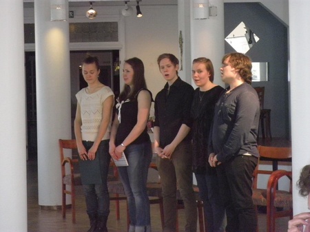 Underhållningen bestod denhär gången av fem elever från Västra Nylands Folkhögskolas teaterlinje, som under en knapp timme, sjöng och spelade teater för oss. Det var ett mycket uppskattat inslag under festen. Troligtvis får vi se mera av dessa duktiga elever i framtiden.